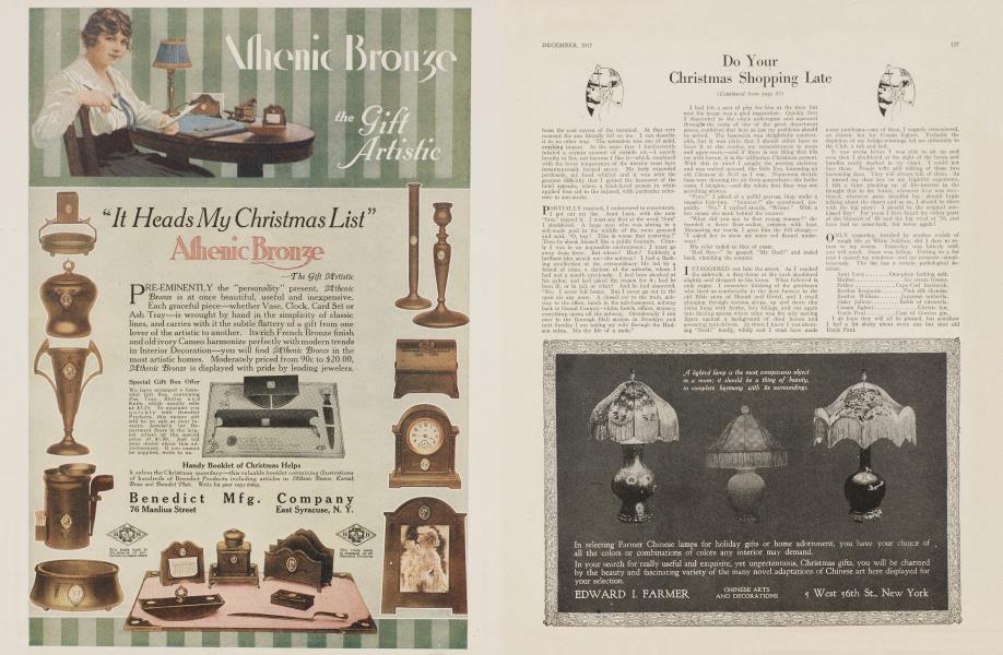 December 1917 George S. ChappellA YEAR ago I had a frightful time with my Christmas shopping. I put it off until too late. I know this is a shocking admission, for it was quite as outré at that time to postpone one's Christmas shopping as it would be nowadays to walk into a war-worn drawing room and boldly demand a cocktail. But it is a fact. Regardless of newspaper slogans, pictures of pleading saleswomen and the dictates of common or preferred sense, I deliberately postponed the evil day, and finally sallied forth on the very eve of our great gift-swapping contest armed with a list, a king's ransom and a determination to do or die.