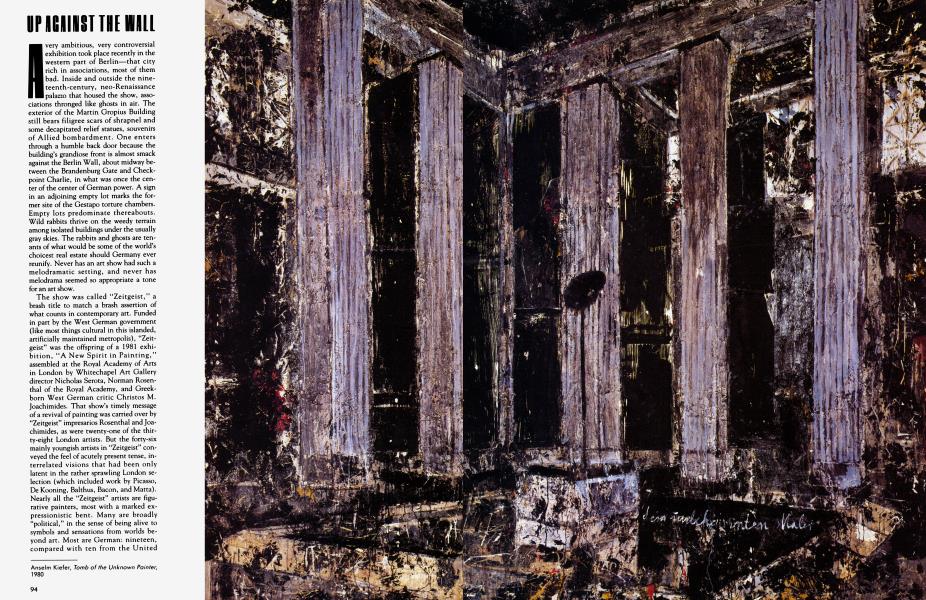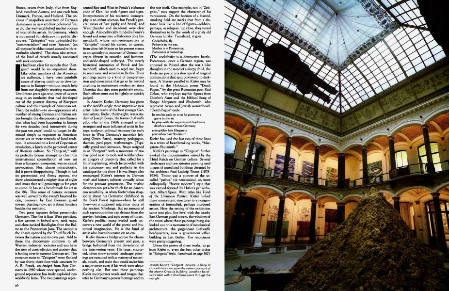 Two great ruptures define present-day Germany. The first is East-West partition, a fact written in barbed wire, tank traps, and close-ranked floodlights from the Baltic to the Franconian Jura. The second is the chasm opened by the Third Reich between the nation and its own past. Add to these the discontents common to all Western industrial societies and you have the stew of contradiction and anxiety that is boiling over in current German art. The entrance stairs to “Zeitgeist” were flanked by two thirty-three-foot-wide canvases by A. R. Penck, an emigre from East Germany in 1980 whose once special, underground reputation has lately exploded into worldwide fame. The two paintings represented East and West in Penck’s elaborate code of Klee-like stick figures and signs. Interpretation of his eccentric iconography is an infant science, but Penck’s general views of East (spiky and brutal) and West (frazzled and decadent) were clear enough. Also politically minded is Penck’s friend and sometime collaborator Jorg Immendorff, whose mini-retrospective at “Zeitgeist” traced his career, or careen, from ultra-left Maoist to his present stance as an apocalyptic mourner of German energies (frozen in swastika-and hammer-and-sickle-shaped icebergs). The nearly hysterical intensities of Penck and Immendorff, which used to repel me, begin to seem sane and sensible in Berlin. Their paintings aspire to a kind of comprehension and conscience that go so far beyond anything in mainstream modem art since Guernica that they seem positively exotic. Such efforts must not be lightly or quickly judged.