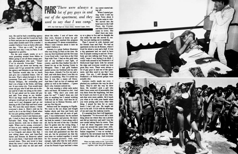 Antonio is a great fashion illustrator who was living in Paris at the time. He was my first boyfriend and the first man I ever lived with. I met him at the Club Sept with Tom. I had on this gold satin suit of my mother's—real tight, of course—and this blue feather boa she'd found for me at the Sewing Center in Mesquite. Then I had gold feathers pasted across my forehead and my platform shoes. Already I'm five ten and a half, and with these shoes I was like six three or something. Plus I'd curled my hair. It was like a mane—all frizzy. And then I had on lots of makeup and glitter as well as the feathers... I guess that's why Antonio noticed me.