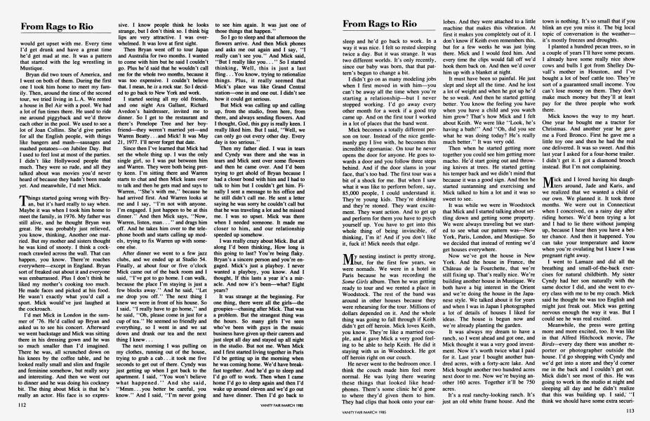 Things started going wrong with Bryan, but it's hard really to say when. Maybe it was when I took him home to meet the family, in 1976. My father was still alive, and he thought Bryan was great. He was probably just relieved, you know, thinking, Another one married. But my mother and sisters thought he was kind of snooty. I think a cockroach crawled across the wall. That can happen, you know. There're roaches everywhere—except in England. Bryan sort of freaked out about it and everyone was embarrassed. Plus I don't think he liked my mother's cooking too much. He made faces and picked at his food. He wasn't exactly what you'd call a sport. Mick would've just laughed at the cockroach.
