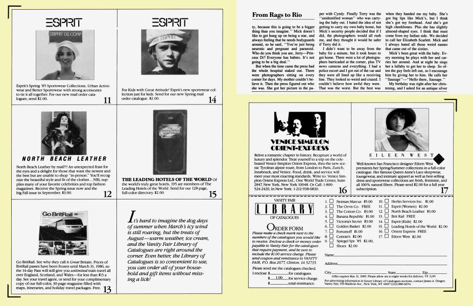 March 1985 Christopher HemphillLearn how a gangly ol' girl from the Texas flatlands ran away to Paris and, quicker than you can say Jumpin' Jack Flash, became a world-famous model, danced on tabletops with Grace Jones, bought herself a ranch, lassoed the slippery Mick Jagger, and birthed the new Jogger baby, Elizabeth Scarlett. Photographer ANNIE LEIBOVITZ caught up with Jerry in Rio, where she and Mick were making videos of his debut solo album. There, just in time for Mardi Gras, the dazzling Ms. Hall modeled Carnival costumes exclusively for y'all. She's only rock 'n' roll, but we like her. Now read on