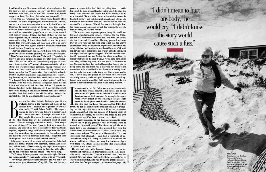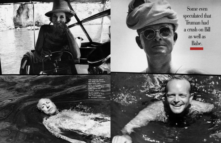 Few readers could have guessed that Dillon was supposed to represent Bill Paley. He did not look or act like Bill, and there were no obvious hints, as there usually are in romans a clef. But to some of those who knew Truman and the Paleys well, it was clear that Bill was his target. The first clue was his description of Dillon's deceived wife, Cleo—"the most beautiful creature alive," in Lady Coolbirth's reverential words. Truman employed such extravagant language to describe only one mortal, Babe Paley; even Lee Radziwill was not accorded such an encomium. The second clue was his emphasis on Dillon's hungering for Wasp gentility; Truman was convinced that Bill Paley shared that appetite as well. In any event, he thought that by means of such cryptic signals he was doing to Bill what the former governor's wife had done to Dillon: putting him in his place. Through words, he liked to think that he was hitting perhaps the only vulnerable spot possessed by a man of such monarchical self-confidence: his sensitivity about being a Jew.