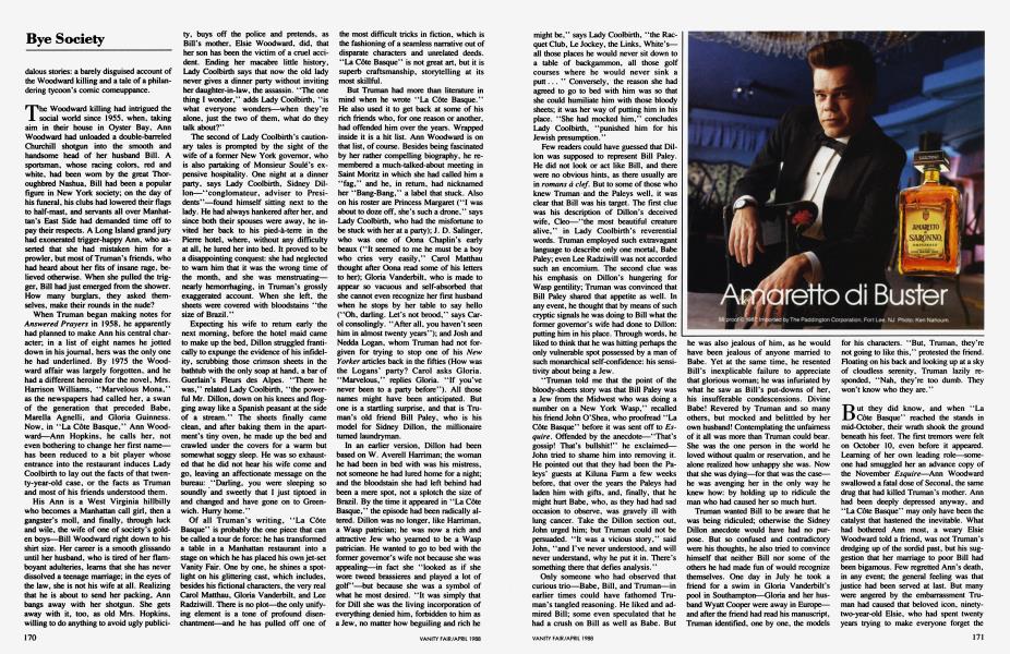 But they did know, and when "La Côte Basque" reached the stands in mid-October, their wrath shook the ground beneath his feet. The first tremors were felt on October 10, even before it appeared. Learning of her own leading role—someone had smuggled her an advance copy of the November Esquire—Ann Woodward swallowed a fatal dose of Seconal, the same drug that had killed Truman's mother. Ann had been deeply depressed anyway, and "La Côte Basque" may only have been the catalyst that hastened the inevitable. What had bothered Ann most, a weary Elsie Woodward told a friend, was not Truman's dredging up of the sordid past, but his suggestion that her marriage to poor Bill had been bigamous. Few regretted Ann's death, in any event; the general feeling was that justice had been served at last. But many were angered by the embarrassment Truman had caused that beloved icon, ninetytwo-year-old Elsie, who had spent twenty years trying to make everyone forget the scandal.' Now, in a few paragraphs, he had destroyed her hard work.