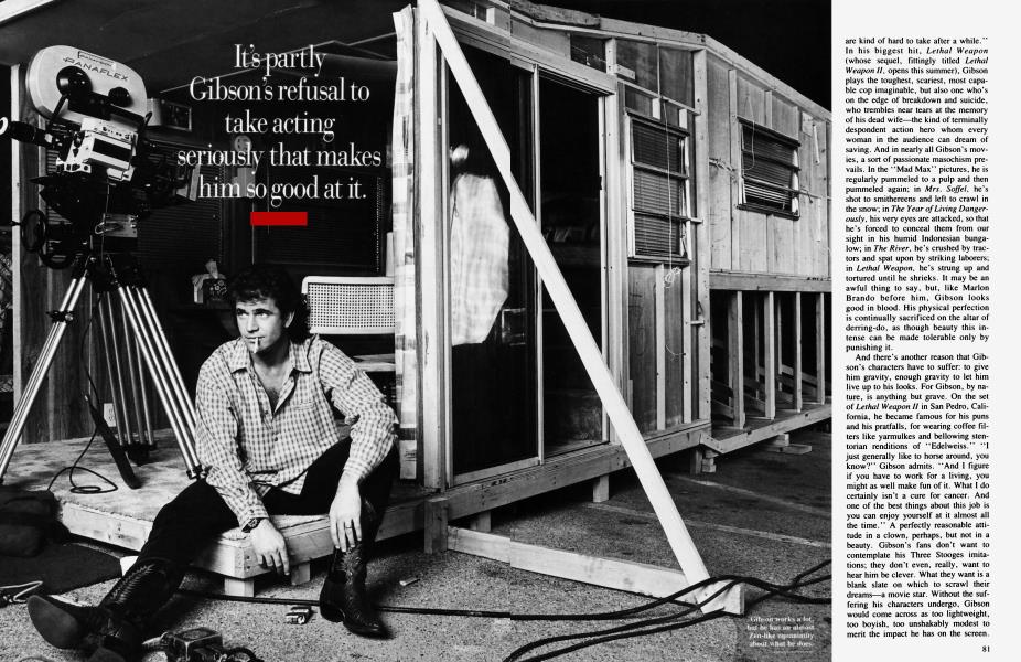 And there's another reason that Gibson's characters have to suffer: to give him gravity, enough gravity to let him live up to his looks. For Gibson, by nature, is anything but grave. On the set of Lethal Weapon II in San Pedro, California, he became famous for his puns and his pratfalls, for wearing coffee filters like yarmulkes and bellowing stentorian renditions of "Edelweiss." "I just generally like to horse around, you know?" Gibson admits. "And I figure if you have to work for a living, you might as well make fun of it. What I do certainly isn't a cure for cancer. And one of the best things about this job is you can enjoy yourself at it almost all the time." A perfectly reasonable attitude in a clown, perhaps, but not in a beauty. Gibson's fans don't want to contemplate his Three Stooges imitations; they don't even, really, want to hear him be clever. What they want is a blank slate on which to scrawl their dreams—a movie star. Without the suffering his characters undergo, Gibson would come across as too lightweight, too boyish, too unshakably modest to merit the impact he has on the screen. "He has an Australian quality," says the Aussie director George Miller, who gave him his first big acting break, in Mad Max, and then made him an international star in The Road Warrior. "He's very shy. And it's difficult to be Australian and to be self-important. Mel never will be."