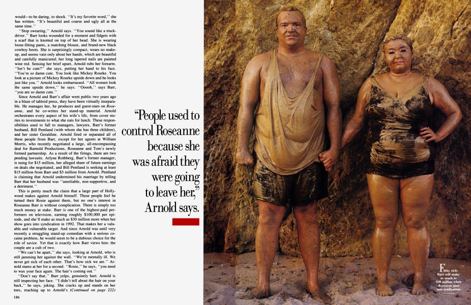 This is pretty much the claim that a large part of Hollywood makes against Arnold himself. These people feel he turned their Rosie against them, but no one's interest in Roseanne Barr is without complication. There is simply too much money at stake. Barr is one of the highest-paid performers on television, earning roughly $100,000 per episode, and she'll make as much as $30 million more when her show goes into syndication in 1992. That makes her a valuable and vulnerable target. And since Arnold was until very recently a struggling stand-up comedian with a serious cocaine problem, he would seem to be a dubious choice for the role of savior. Yet that is exactly how Barr views him: the couple are a cult of two.