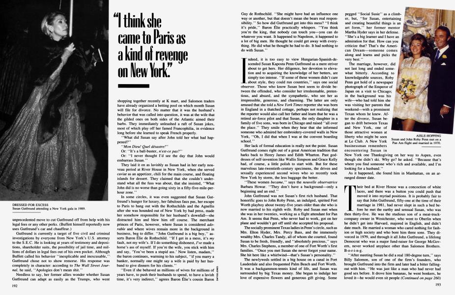 In some circles, it was even suggested that Susan Gutfreund's hunger for luxury, her fabulous faux pas, her escape to Paris to hang out with the Rothschilds and the Agnellis after she was hounded out of New York by bad press, made her somehow responsible for her husband's downfall—she distracted him and blew him off course. The merchant princes of Paris, however, where Susan is considered adorable and where wives remain more in the background in business, beg to differ. "John Gutfreund is a big boy," asserts Baron Elie de Rothschild. "If I get in a mess, it's my fault, not my wife's. If I do something dishonest, I've made a horse's ass of myself. If you're the wife, you stick with him and say, 'You've been a stupid ass.' Now listen, madam," the baron continues, warming to his subject, "if you marry a banker, normally one might say a wife is paid by her husband to give dinners for his clients."