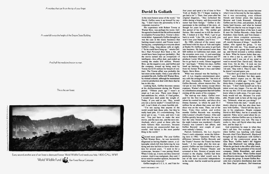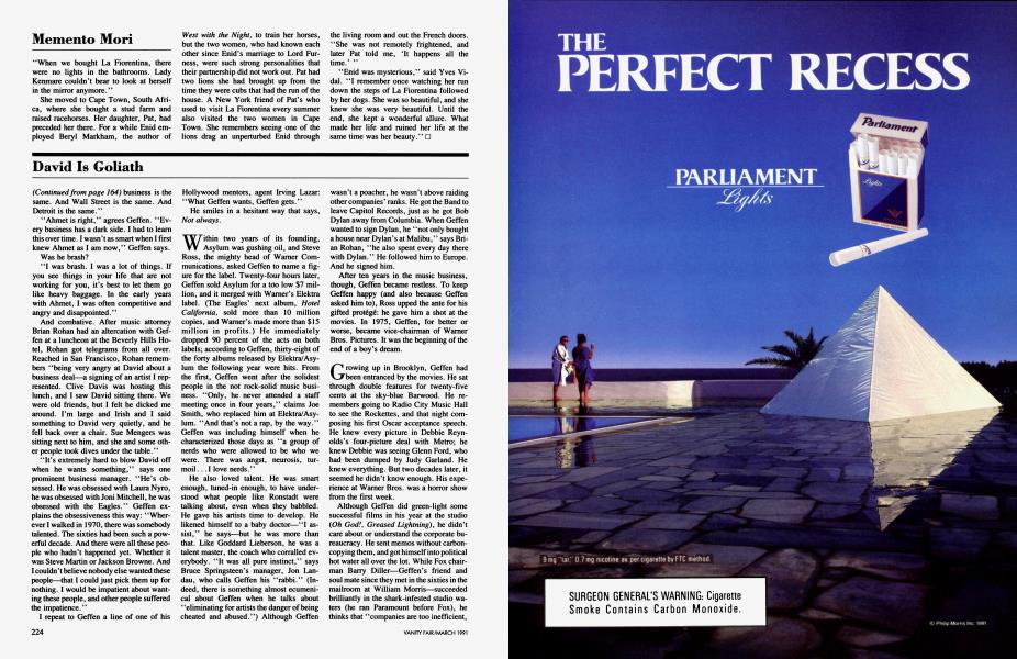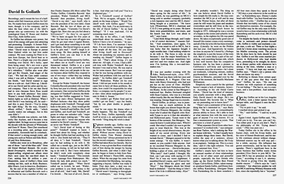 March 1991 Paul RosenfieldRecording mogul David Geffen is part enfant terrible, part last tycoon— and Hollywood can't stop talking about him. The MCA-Matsushita deal made him the richest man in town, he bought (but doesn't live in) Jack Warner's old estate for $47.5 million— and he's still only forty-eight. PAUL ROSENFIELD reports how the street-smart kid from Brooklyn got everything he wants