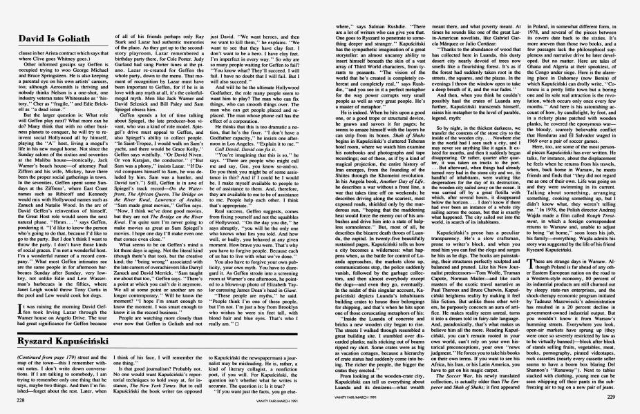 Hollywood's favorite Christmas saga for 1990 wasn't Godfather III, as expected. It was Geffen. Suddenly David had become Goliath. In one week in December, the boyish mogul had been considered for the cover of Newsweek, turned down the cover of GQ, and accepted the cover of Forbes.