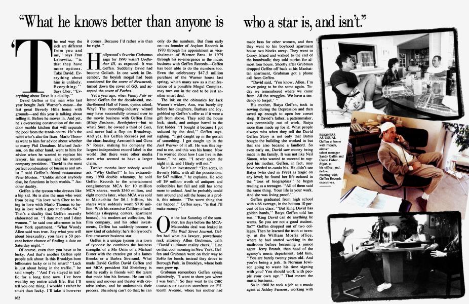 Geffen is a unique tycoon in a town of tycoons: he combines the business strengths of a Mo Ostin or a Michael Eisner with the creative gut of a James Brooks or a Barbra Streisand. What made David Geffen David Geffen and not MCA president Sid Sheinberg is that he really is friends with the talent that made him his fortune. He can talk music and movies and theater with creative artists, and he understands their process. Sheinberg can't do that; he can only do the numbers. But from early on—as founder of Asylum Records in 1970 through his appointment as vicechairman of Warner Bros, in 1975 through his re-emergence in the music business with Geffen Records—Geffen has been able to do the numbers too. Even the celebratory $47.5 million purchase of the Warner house last spring, which many saw as a manifestation of a possible Mogul Complex, may turn out in the end to be just another smart deal.