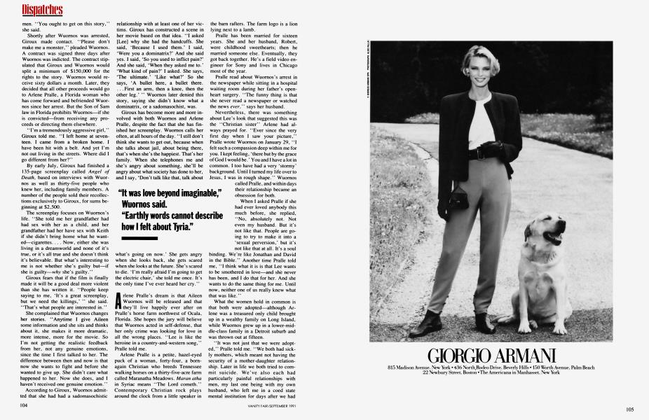 Giroux has become more and more involved with both Wuornos and Arlene Pralle, despite the fact that she has finished her screenplay. Wuornos calls her often, at all hours of the day. "I still don't think she wants to get out, because when she talks about jail, about being there, that's when she's the happiest. That's her family. When she telephones me and she's angry about something, she'll be angry about what society has done to her, and I say, 'Don't talk like that, talk about what's going on now.' She gets angry when she looks back, she gets scared when she looks at the future. She's scared to die. 'I'm really afraid I'm going to get the electric chair,' she told me once. It's the only time I've ever heard her cry."