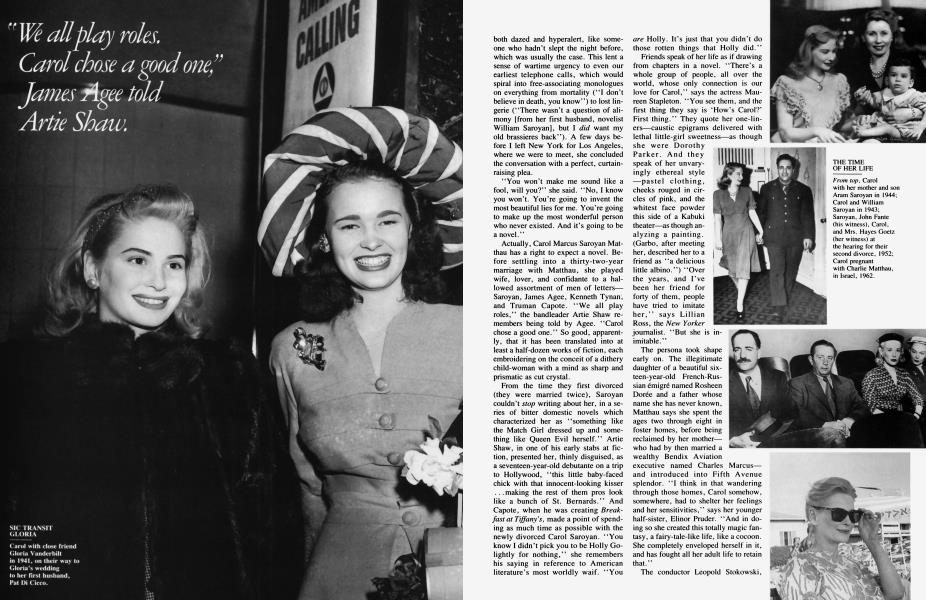 Actually, Carol Marcus Saroyan Matthau has a right to expect a novel. Before settling into a thirty-two-year marriage with Matthau, she played wife, lover, and confidante to a hallowed assortment of men of letters— Saroyan, James Agee, Kenneth Tynan, and Truman Capote. "We all play roles," the bandleader Artie Shaw remembers being told by Agee. "Carol chose a good one." So good, apparently, that it has been translated into at least a half-dozen works of fiction, each embroidering on the conceit of a dithery child-woman with a mind as sharp and prismatic as cut crystal.