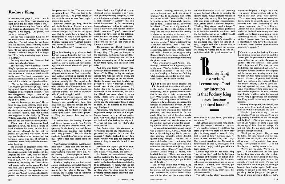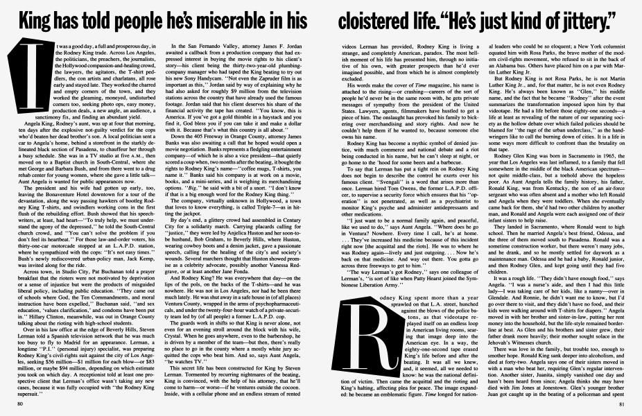 The tight rein has clearly accomplished several crucial goals. If King's life is really in danger, it has kept him safe so far. And it has kept away other lawyers. "There were many attorneys chasing him down, trying to solicit the case, trying to dissuade him from continuing to have Lerman represent him," says Rentzer. Lerman has also successfully kept at bay leaders of the black community who have sought to give King a more public role in confronting racism. "Rodney King is a victim," Lerman says, "and my intention is that Rodney King never become political fodder, never become ammunition for somebody's agenda."