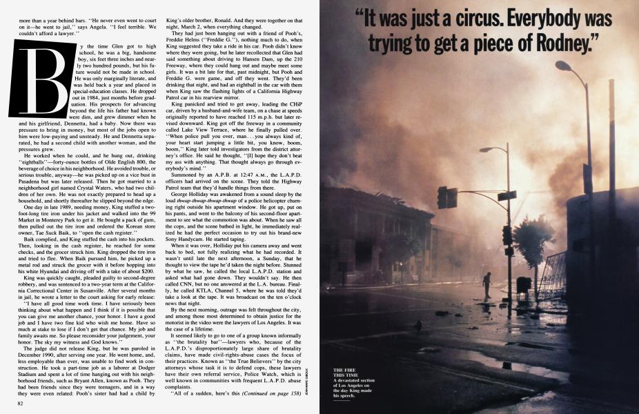 But Rodney King is not Rosa Parks, he is not Martin Luther King Jr., and, for that matter, he is not even Rodney King. He's always been known as "Glen," his middle name, and the fact that he became "Rodney" after the event summarizes the transformation imposed upon him by that videotape. He had a life before those eighty-one seconds—a life at least as revealing of the nature of our separating society as the hollow debate over which failed policies should be blamed for "the rage of the urban underclass," as the handwringers like to call the burning down of cities. It is a life in some ways more difficult to confront than the brutality on that tape.