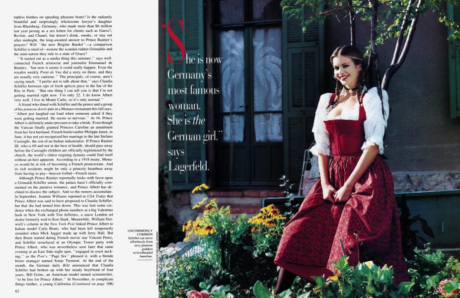 Sign In Not a Subscriber?Join NowAs a $6-million-a-year supermodel, Claudia Schiffer breathes the thin air of fashion royalty. Yet she is, by most accounts, refreshingly clearheaded. Will this alluring small-town girl become Prince Albert's wife, and Monaco's future princess? BOB COLACELLO went to Paris to meet the German-born goddess who many hope will become the next Grace Kelly