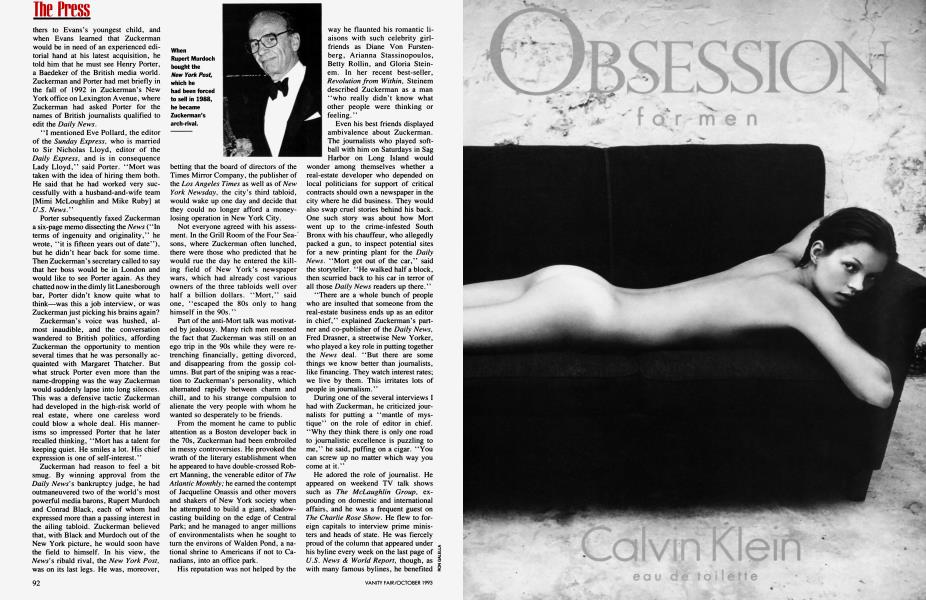 October 1993 Edward Klein Jonathan BeckerEarly one evening last December, Mortimer Zuckerman appeared out of an elevator of the Lanesborough hotel in London. The lobby was abuzz with Christmas shoppers, but Zuckerman, a slight figure with thinning brown hair, stood out in the crowd. "He looked immaculate in slacks and a tweed jacket," recalled the British journalist Henry Porter, "and he had a wicked little grin on his face that reminded me of Jack Nicholson in The Witches of Eastwick.”
