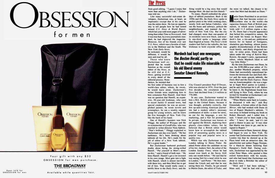 At about this time, Zuckerman began his second seduction of Martin Dunn, who was adjusting to his new life in Boston. Dunn was spending a good deal of time watching CNN, World News Tonight, and the local news in his Boston Herald office. "Zuckerman was calling Martin constantly," recalled Alan Eisner, Dunn's managing editor. "I know Martin was upset, the way he had been treated, but Zuckerman kept on pushing the relationship.