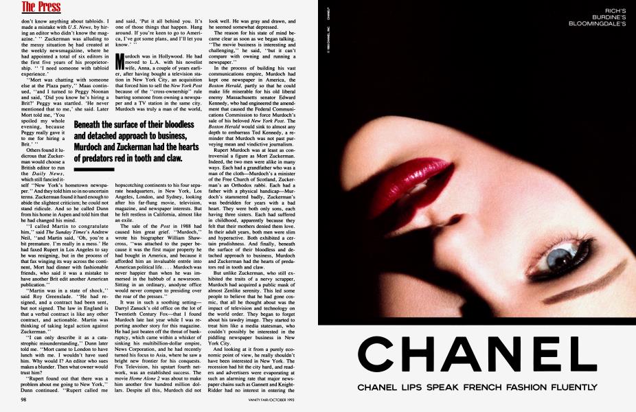 October 1993 Edward Klein Jonathan BeckerMedia moguls Mortimer Zuckerman and Rupert Murdoch rode into New York to save its ailing tabloids—the Daily News and the Post, respectively. Is the town big enough for both publishers, or will paper bullets fly?