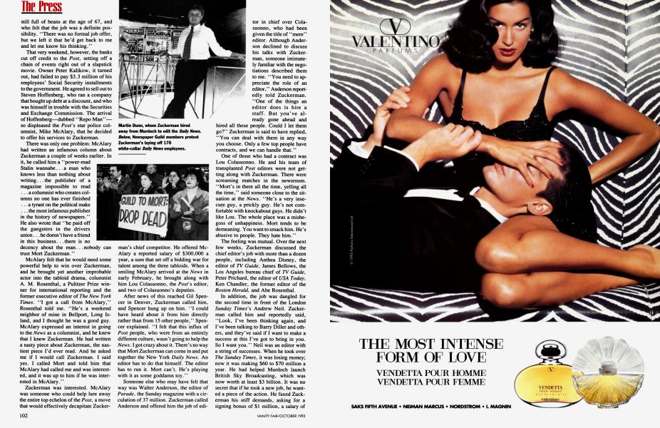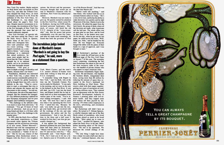 Zuckerman had reason to feel a bit smug. By winning approval from the Daily News's bankruptcy judge, he had outmaneuvered two of the world's most powerful media barons, Rupert Murdoch and Conrad Black, each of whom had expressed more than a passing interest in the ailing tabloid. Zuckerman believed that, with Black and Murdoch out of the New York picture, he would soon have the field to himself. In his view, the News's ribald rival, the New York Post, was on its last legs. He was, moreover, betting that the board of directors of the Times Mirror Company, the publisher of the Los Angeles Times as well as of New York Newsday, the city's third tabloid, would wake up one day and decide that they could no longer afford a moneylosing operation in New York City.