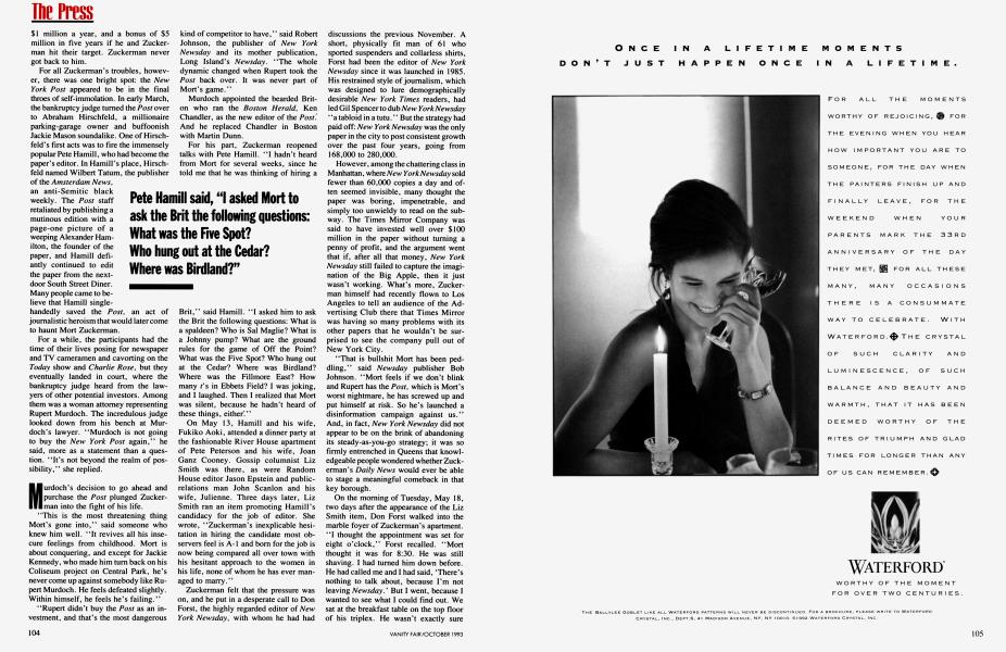 For his part, Zuckerman reopened talks with Pete Hamill. "I hadn't heard from Mort for several weeks, since he told me that he was thinking of hiring a