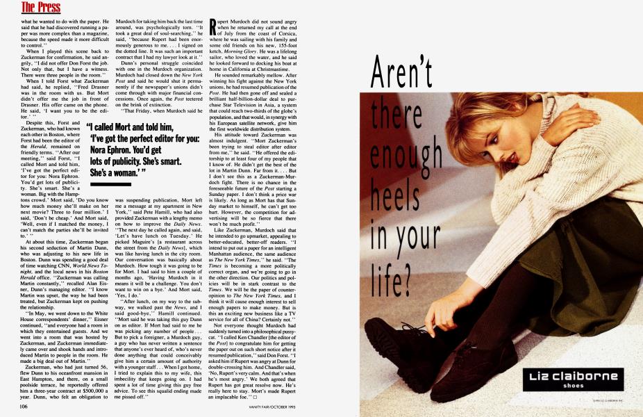 Despite this, Forst and Zuckerman, who had known each other in Boston, where Forst had been the editor of the Herald, remained on friendly terms. "After our meeting," said Forst, "I called Mort and told him, 'I've got the perfect editor for you: Nora Ephron. You'd get lots of publicity. She's smart. She's a woman. Big with the Hamptons crowd.' Mort said, 'Do you know how much money she'll make on her next movie? Three to four million.' I said, 'Don't be cheap.' And Mort said, 'Well, even if I matched the money, I can't match the parties she'll be invited to.' "