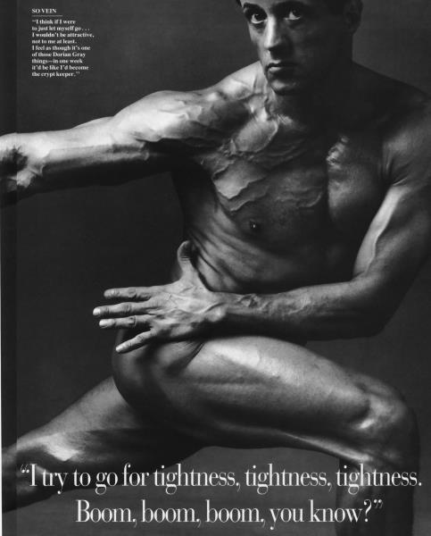 "I don't know," Stallone says. "I don't know if it's because of a tremendous insecurity or a vacuum that's unfathomable, that I can never fill—a void in my childhood—but there's a sense that I'm incomplete. It just takes a continual challenge to validate my ... I could never just walk away and say, 'O.K., I did it all, I'm done'... I believe the world is real rough. Real rough. It's kind of a barroom brawl. You just try to survive it and the only way I survive it is by constant challenges."