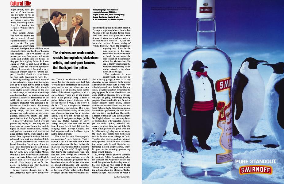 "This is the first time I have played a policewoman," says Mirren, "but I wouldn't say it is the first time I have played a character like her. In fact, the character I have played that is closest to her is Lady Macbeth." Tough though that lady's life undoubtedly was, and fast and loose though her attitude toward law and order may have been, she never had to console a policeman who'd been bitten by a male hooker with AIDS, or attend exhumations and autopsies that made strong men lurch and vomit, or have an off-duty affair with a black colleague and tell him very bluntly that he'd better keep his mouth shut about it. Perhaps it helps that Mirren lives in Los Angeles with the director Taylor Hackford, who made An Officer and a Gentleman. It gives her a cultural edge in the mid-Atlantic world of TV, and perhaps also in the fictional setting of "Prime Suspect," where the officers are anything but. Rare is the male superior in this series whose neck is not wider than his head. In one scene, the open secret of Freemasonry within the Metropolitan Police is bluntly mentioned: the unofficial freemasonry of the macho network is the whole theme of the trilogy.