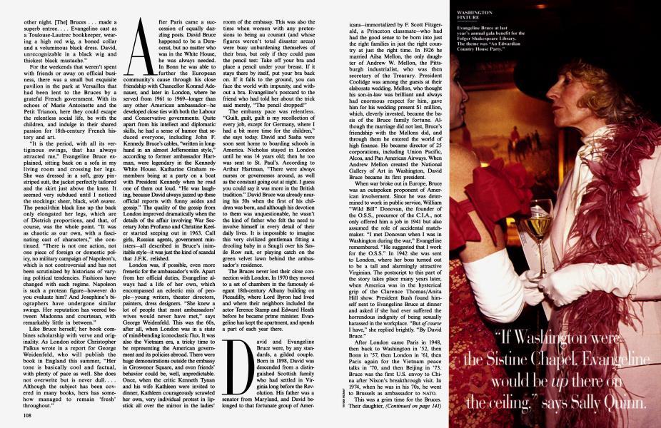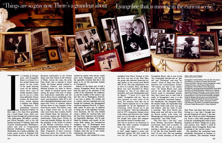 Indeed, for the better part of half a century, Evangeline Bruce has quietly held her place at the epicenter of the world of the influential, the intellectual, and the wealthy of the nation's capital. Her role in Washington, however, is not easy to define. Put crudely, she is a player, and has remained one even though her husband, the distinguished American diplomat David K. E. Bruce, died nearly 20 years ago. In addition to being one of the legendary Georgetown hostesses, she has also helped create a shelter for runaway kids, and her first book, Napoleon and Josephine: An Improbable Marriage, will be published by Scribner next month. As the writer Sally Quinn, her Georgetown neighbor, says, "If Washington were the Sistine Chapel, Evangeline would be up there on the ceiling." Katharine Graham sums her up in two words: enchantress and seductress.