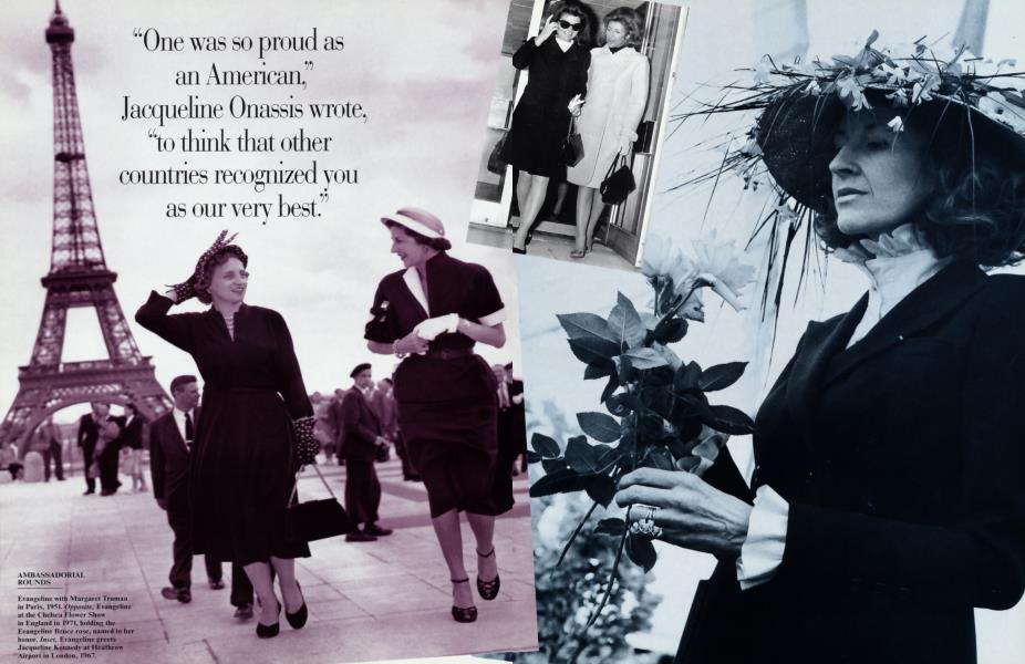 David Bruce, who worked for every president from Harry Truman to Gerald Ford, was one of the Wise Men, the group who directed American foreign policy in the crucial post-World War II era. The only ambassador ever to serve in London, Paris, and Bonn, Bruce was once described by Henry Kissinger as "one of our ablest ambassadors and most distinguished public figures." "I know it's a tired old cliche," Evangeline told me, "but we were partners in every sense of the word. For instance, from day one in Paris, David expected me to be solely responsible for all the diplomatic entertaining, which forced me to get over my shyness." After the ambassador died in 1977, Jacqueline Onassis wrote to his widow and referred to the "bright path you cut through an age where so few people have grace and imagination and the virtues of another time. . . . One was so proud as an American to think that other countries recognized you as our very best."