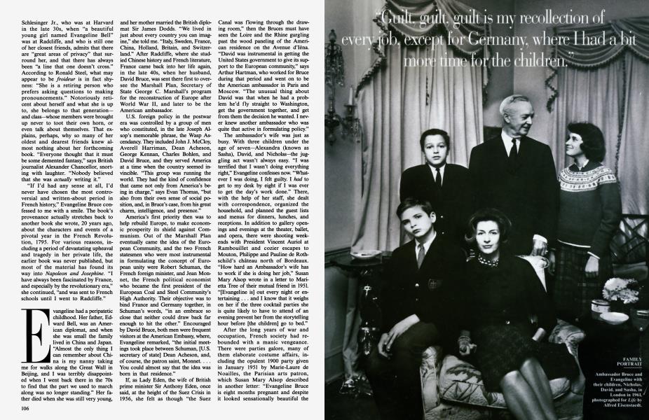 Evangeline had a peripatetic childhood. Her father, Edward Bell, was an American diplomat, and when she was small the family lived in China and Japan. "Almost the only thing I can remember about China is my nanny taking me for walks along the Great Wall in Beijing, and I was terribly disappointed when I went back there in the 70s to find that the part we used to march along was no longer standing." Her father died when she was still very young, and her mother married the British diplomat Sir James Dodds. "We lived in just about every country you can imagine," she told me. "Italy, Sweden, France, China, Holland, Britain, and Switzerland." After Radcliffe, where she studied Chinese history and French literature, France came back into her life again, in the late 40s, when her husband, David Bruce, was sent there first to oversee the Marshall Plan, Secretary of State George C. Marshall's program for the reconstruction of Europe after World War II, and later to be the American ambassador.