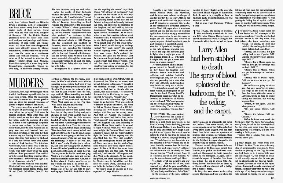 February 1995 Gully WellsEvangeline Bell Bruce, widow of one of America's greatest modern diplomats, is the last of a quietly powerful breed of Washington hostess. But her flawless style masks family tragedy—and her deep commitment to the shelter for runaways she helped establish in memory of her daughter, whose violent death remains unsolved. GULLY WELLS obtains a rare audience as the publication of Bruce's first book reveals another facet of Georgetown's reticent empress.
