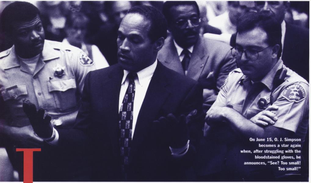 On June 15, O.J. Simpson becomes a star again when, after struggling with the bloodstained gloves, he announces, "See? Too small! Too small!"