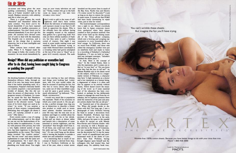 Sign In Not a Subscriber?Join NowPlagued by the celebrity tell-all and the self-justifying memoir, the stranger's description of his underwear or his orgasm, America has become almost impossible to embarrass