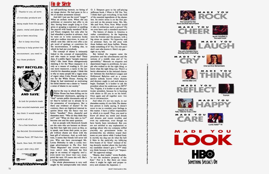 March 1996 Christopher Hitchens Philip BurkePlagued by the celebrity tell-all and the self-justifying memoir, the stranger's description of his underwear or his orgasm, America has become almost impossible to embarrass