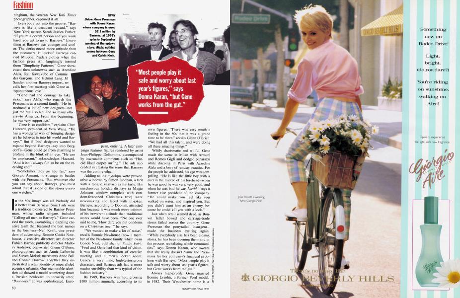 So he returned to the family store. In 1976, exhibiting a keen eye for models and miniskirts, young Gene broke the Barneys tradition of selling only men's clothes by opening a small women's boutique. Before long, he had filled the top two floors of the store with the sexy little dresses of Armani, Chloe, and Missoni. He even started his own youthful fashion line, Basco. Gene loved attending the designer shows in Europe, showing up at formal parties in tight jeans, T-shirt, and tan. He created a stir with his club-hopping lifestyle and girl-in-every-showroom exploits, and he was known for his appetites—for sex and cocaine. "In my younger days, before I was married," he admits, "I lived a more free-spirited life." Some legends never die: Almost everyone interviewed for this piece had an unprintable Gene Pressman story. Many involved beautiful blondes, unusual places, and outrageous public displays of affection. As Vogue editor Anna Wintour once noted, "Gene is one of the few straight guys in the business, and he enjoys it."