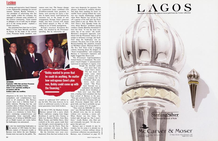 And very nasty. The two brothers are speaking again, but only because they have to. Bob, according to a family source, believes he is being set up by his brother as the fall guy since he was technically in charge of finances. But because of the way the family trust is structured, no one had the power to act alone. Gene and Fred presumably had to sign off on the loans Barneys obtained. In an attempt to head off disaster, Bob made numerous trips to Tokyo—without Gene—in 1994 and 1995. A source close to the Pressmans claims that Bob tried to persuade the Japanese to convert their investment and the loans personally guaranteed into equity equaling up to 49 percent of Barneys. Gene had opposed giving Isetan equity. But, according to the source, "Bob convinced Fred to pressure Gene to agree."