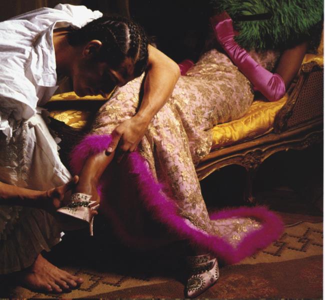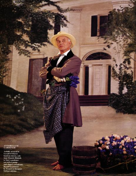 ANTEBELLUM GARDENER Artfully arrayed in Gerald O'Hara's hand-me-downs, sole man Manolo Blahnik is Tara's gardener (as well as pump-and-slipper consultant). Backdrop painted by French set designer Stéfan Lubrina.