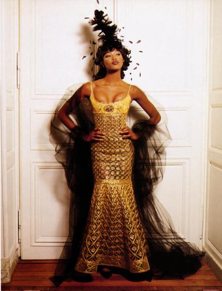 THE YANKEES ARE COMING! Our fin de siècle Scarlett, Naomi Campbell, wears "Valentine," a silk-doupion gala suit by Gianfranco Ferrè for Christian Dior Haute Couture, spring-summer 1996. Meanwhile, Rhett Butler—Charlton Cannon in an evening shirt by Charvet and Vivienne Westwood smoking trousers—suggests a last kiss before the last stand.