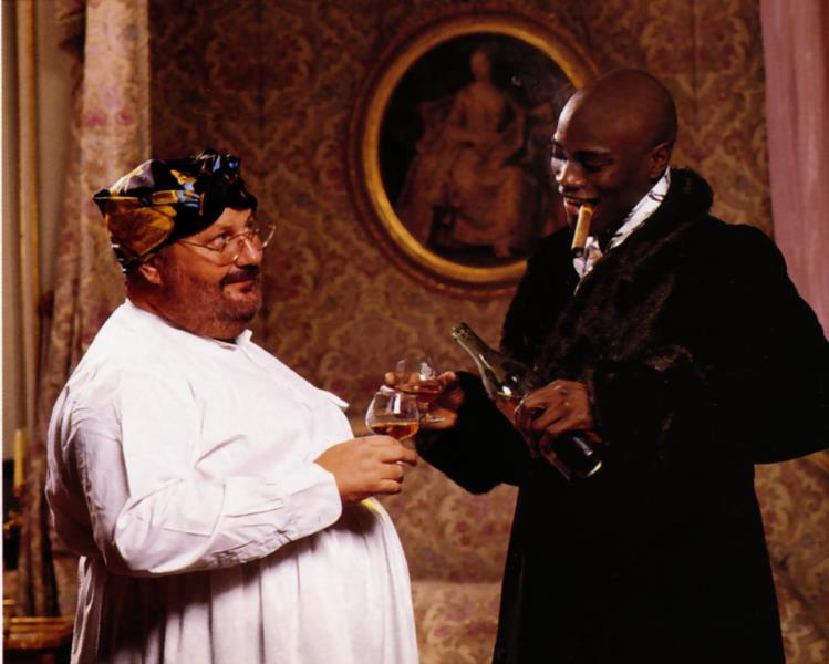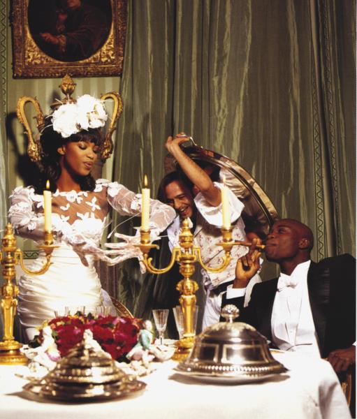in a cameo as Mammy, and wearing his own white shirt and apron, Gianfranco Ferrè toasts proud papa Rhett, beaming in Vivienne Westwood's velvet greatcoat with fake-fur collar.