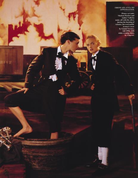 FROM ATLANTA TO APPOMATTOX House servants Shalom Harlow and Amber Valletta make off with the silver during the burning of Atlanta, dressed nattily in men's wear by Gianni Versace, fall 1996, with white evening shirts by Charvet.