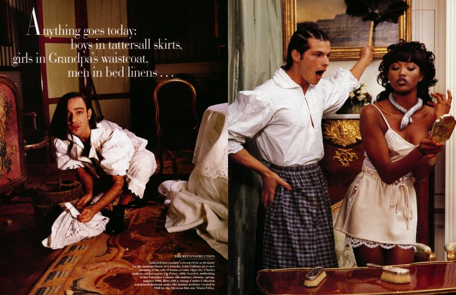 May 1996 Laura Jacobs Andre Leon Talley"Fiddledee-dee," that's my philosophy! Why, as the millennium turns there's more than a little fiddle-while-Atlanta-burns mentality on the catwalk. Day's night today and black's white today (and white's black today!) and anything goes: boys in tattersall skirts, girls in Grandpa's waistcoat, men in bed linens, silk crinolines that could engulf an elephant (I'm not even counting what some of the couturiers wear).