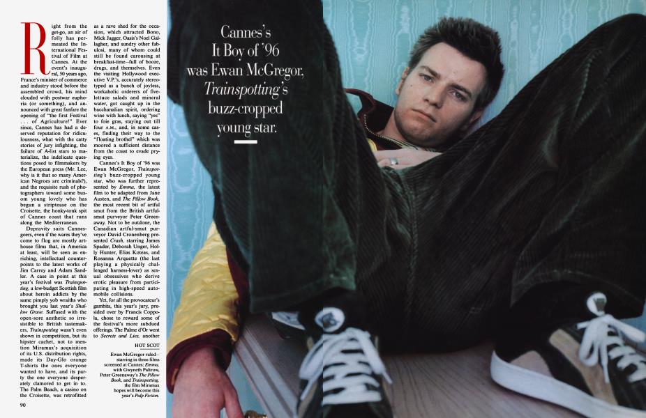 Depravity suits Cannes-goers, even if the wares they've come to flog are mostly arthouse films that, in America at least, will be seen as enriching, intellectual counterpoints to the latest works of Jim Carrey and Adam Sandler. A case in point at this year's festival was Trainspotting, a low-budget Scottish film about heroin addicts by the same pimply yob wraiths who brought you last year's Shallow Grave. Suffused with the open-sore aesthetic so irresistible to British tastemakers, Trainspotting wasn't even shown in competition, but its hipster cachet, not to mention Miramax's acquisition of its U.S. distribution rights, made its Day-Glo orange T-shirts the ones everyone wanted to have, and its party the one everyone desperately clamored to get in to. The Palm Beach, a casino on the Croisette, was retrofitted as a rave shed for the occasion, which attracted Bono, Mick Jagger, Oasis's Noel Gallagher, and sundry other fabulosi, many of whom could still be found carousing at breakfast-time—full of booze, drugs, and themselves. Even the visiting Hollywood executive V.P.'s, accurately stereotyped as a bunch of joyless, workaholic orderers of five-lettuce salads and mineral water, got caught up in the bacchanalian spirit, ordering wine with lunch, saying "yes" to foie gras, staying out till four A.M., and, in some cases, finding their way to the "floating brothel" which was moored a sufficient distance from the coast to evade prying eyes.