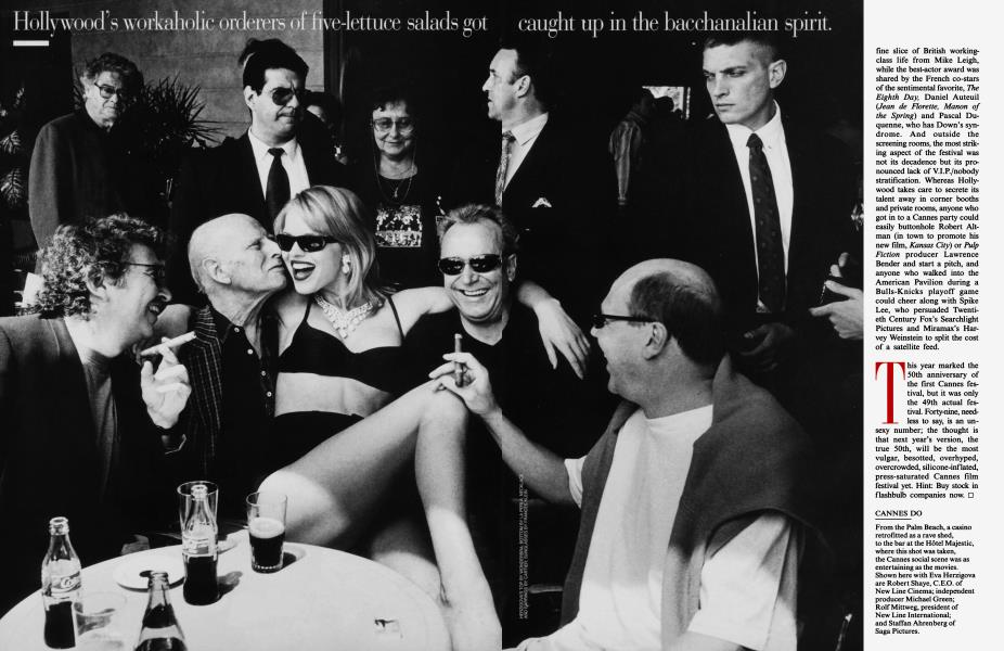 Yet, for all the provocateur's gambits, this year's jury, presided over by Francis Coppola, chose to reward some of the festival's more subdued offerings. The Palme d'Or went to Secrets and Lies, another fine slice of British working-class life from Mike Leigh, while the best-actor award was shared by the French co-stars of the sentimental favorite, The Eighth Day, Daniel Auteuil (Jean de Florette, Manon of the Spring) and Pascal Duquenne, who has Down's syndrome. And outside the screening rooms, the most striking aspect of the festival was not its decadence but its pronounced lack of V.I.P./nobody stratification. Whereas Hollywood takes care to secrete its talent away in comer booths and private rooms, anyone who got in to a Cannes party could easily buttonhole Robert Altman (in town to promote his new film, Kansas City) or Pulp Fiction producer Lawrence Bender and start a pitch, and anyone who walked into the American Pavilion during a Bulls-Knicks playoff game could cheer along with Spike Lee, who persuaded Twentieth Century Fox's Searchlight Pictures and Miramax's Harvey Weinstein to split the cost of a satellite feed.
