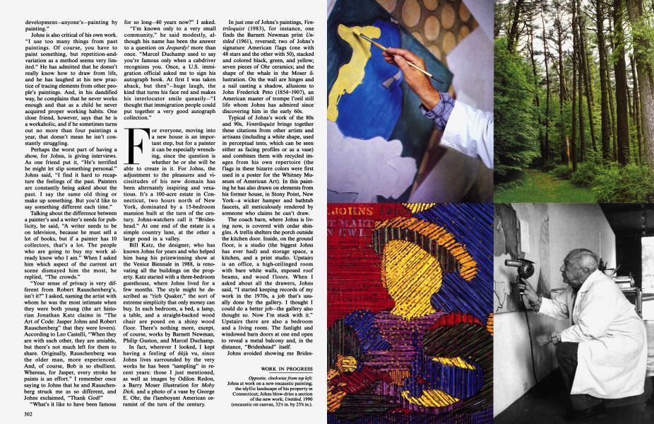 Johns's Buddhist calm has been subjected to a few trials recently, though only of the exalted sort befitting America's most famous painter—and one of the two or three highest-paid artists in the world. (In 1988 his False Start sold for $17 million to publishing magnate S. I. Newhouse, a record for a living artist and an anomaly, according to Johns's longtime dealer, Leo Castelli, when the "going price at the time was just $8 or $9 million.") These trials, as in a medieval legend, are three in number—an exhibition, a house, and a book.