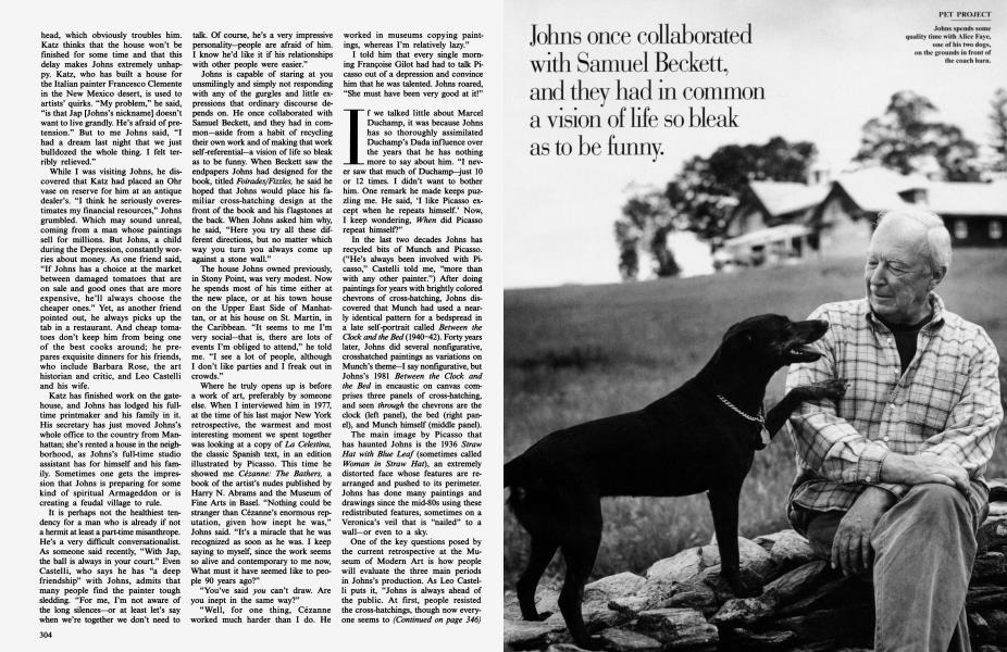 Johns is capable of staring at you unsmilingly and simply not responding with any of the gurgles and little expressions that ordinary discourse depends on. He once collaborated with Samuel Beckett, and they had in common—aside from a habit of recycling their own work and of making that work self-referential—a vision of life so bleak as to be funny. When Beckett saw the endpapers Johns had designed for the book, titled Foirades/Fizzles, he said he hoped that Johns would place his familiar cross-hatching design at the front of the book and his flagstones at the back. When Johns asked him why, he said, "Here you try all these different directions, but no matter which way you turn you always come up against a stone wall."