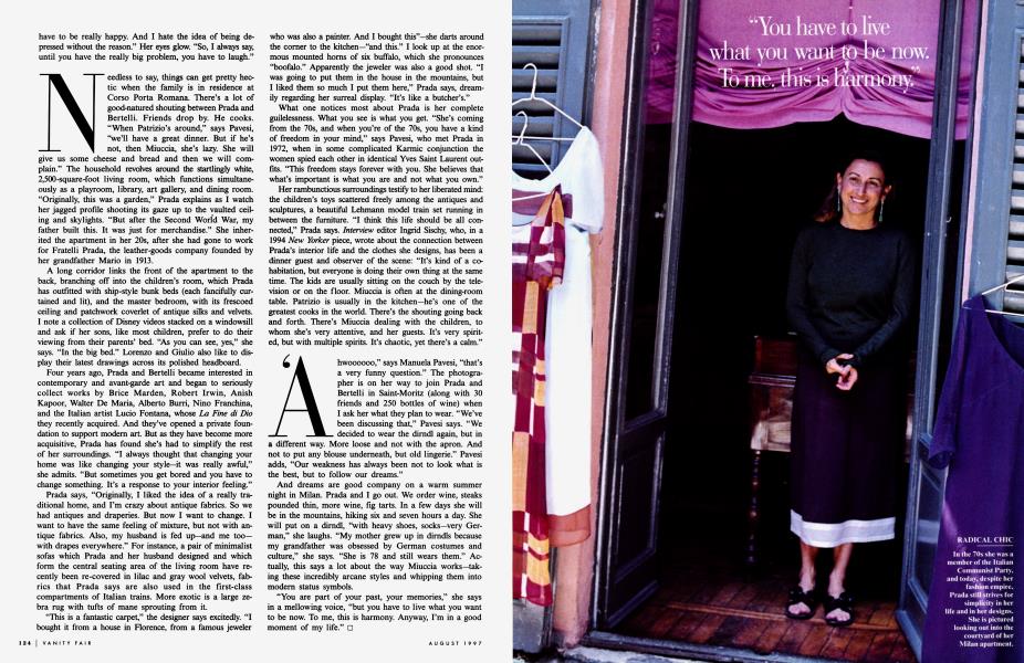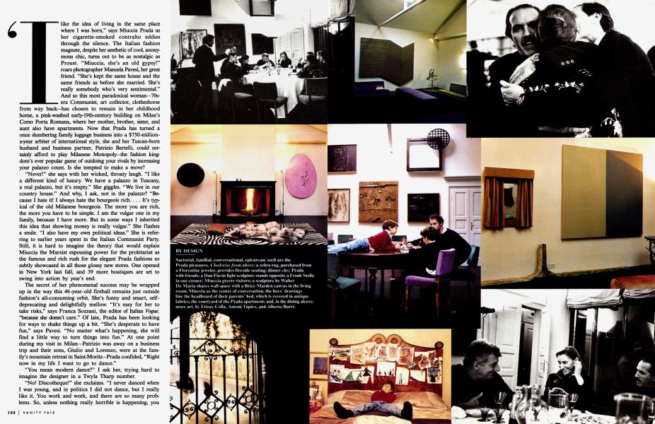 August 1997 Cathy Horyn Pascal Chevallier'I like the idea of living in the same place where I was born," says Miuccia Prada as her cigarette-smoked contralto eddies through the silence. The Italian fashion magnate, despite her aesthetic of cool, anonymous chic, turns out to be as nostalgic as Proust. "Miuccia, she's an old gypsy!" roars photographer Manuela Pavesi, her great friend. "She's kept the same house and the same friends as before she married. She's really somebody who's very sentimental." And so this most paradoxical woman—70s-era Communist, art collector, clotheshorse from way back—has chosen to remain in her childhood home, a pink-washed early-19th-century building on Milan's Corso Porta Romana, where her mother, brother, sister, and aunt also have apartments. Now that Prada has turned a once slumbering family luggage business into a $750-million-a-year arbiter of international style, she and her Tuscan-born husband and business partner, Patrizio Bertelli, could certainly afford to play Milanese Monopoly—the fashion kingdom's ever popular game of outdoing your rivals by increasing your palazzo count. Is she tempted to make a move?