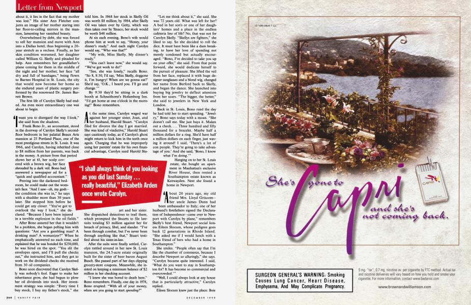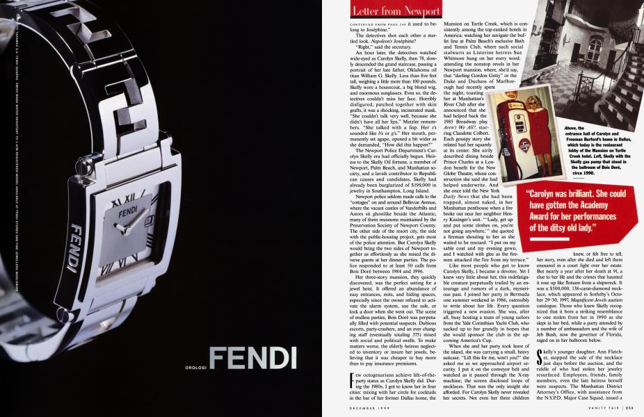 Few octogenarians achieve life-of-the-party status as Carolyn Skelly did. During the 1980s, I got to know her in four cities: mixing with her circle for cocktails in the bar of her former Dallas home, the Mansion on Turtle Creek, which is consistently among the top-ranked hotels in America; watching her navigate the buffet line at Palm Beach's exclusive Bath and Tennis Club, where such social stalwarts as Listerine heiress Sue Whitmore hung on her every word; attending the nonstop revels in her Newport mansion, where, she'd say, that "darling Gordon Getty" or the Duke and Duchess of Marlborough had recently spent the night; toasting her at Manhattan's River Club after she announced that she had helped back the 1985 Broadway play Aren't We All?, starring Claudette Colbert. Each gossipy story she related had her squarely at its center. She airily described dining beside Prince Charles at a London benefit for the New Globe Theatre, whose construction she said she had helped underwrite. And she once told the New York Daily News that she had been trapped, almost naked, in her Manhattan penthouse when a fire broke out near her neighbor Henry Kissinger's unit. '"Lady, get up and put some clothes on, you're not going anywhere,'" she quoted a fireman shouting to her as she waited to be rescued. "I put on my sable coat and my evening gown, and I watched with glee as the firemen attacked the fire from my terrace."