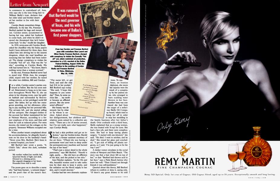 A darker rumor circulates in the social circles of Newport and Palm Beach. "The story was that a hair dryer fell on top of her," or that "Burford had thrown acid in her face," says a Palm Beach heiress who knew her well. "Then I found out through friends it was self-mutilation."