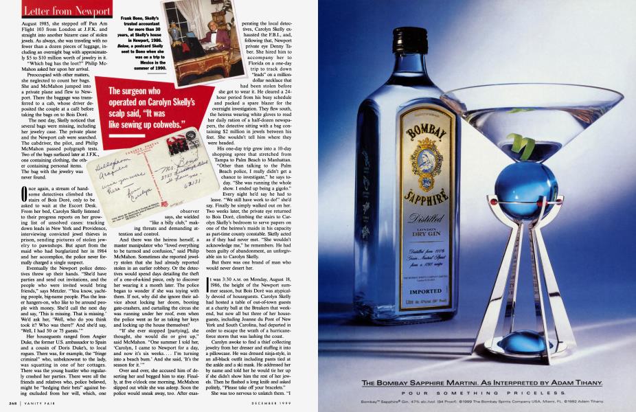 But when she phoned that December, regarding $1.6 million worth of missing, newly purchased jewelry, the detectives received their first concrete clue. She had just come back from a two-month jewelry-buying vacation in London, where, she told friends, she'd spent a night in Buckingham Palace. Upon her return to Newport, she hid her approximately $ 1.6 million in purchases in her shoe closet, then flew to St. Louis with her son to attend a funeral. In St. Louis, she decided to have the new purchases flown over for appraisal at the St. Louis branch of Neiman Marcus. But when her son, who had gone back to Newport after the funeral, went to retrieve the jewelry, the bag was missing. A few days after returning home to Newport, Carolyn and four others received an anonymous letter in the mail. Headed "The Skelly Jewels," the letter contradictorily maintained that her jewels had been stolen at J.F.K. airport:
