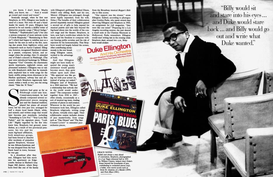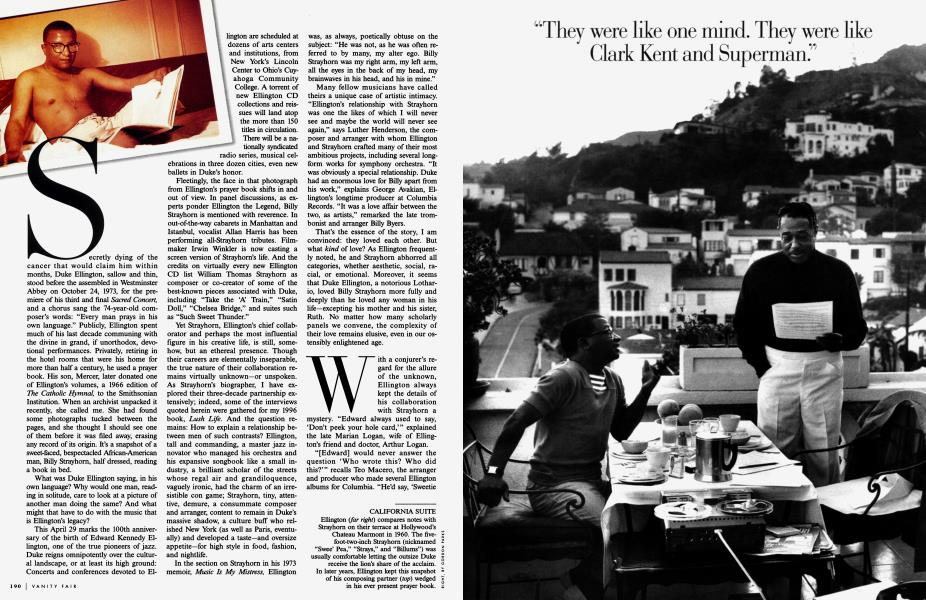 Sign In Not a Subscriber?Join NowAs the 100th anniversary of Duke Ellington's birth spawns tributes in more than three dozen cities, the jazz king's life still holds a central mystery: the indefinable bond between Ellington, a notorious Lothario, and composer Billy Strayhorn, whose open homosexuality was rare in its day. DAVID HAJDU, president of the Duke Ellington Society and Strayhorn's biographer, examines a collaboration that began in 1938 with an instantaneous meeting of musical minds and led to such classics as "Take the 'A" Train" and "Satin Doll."