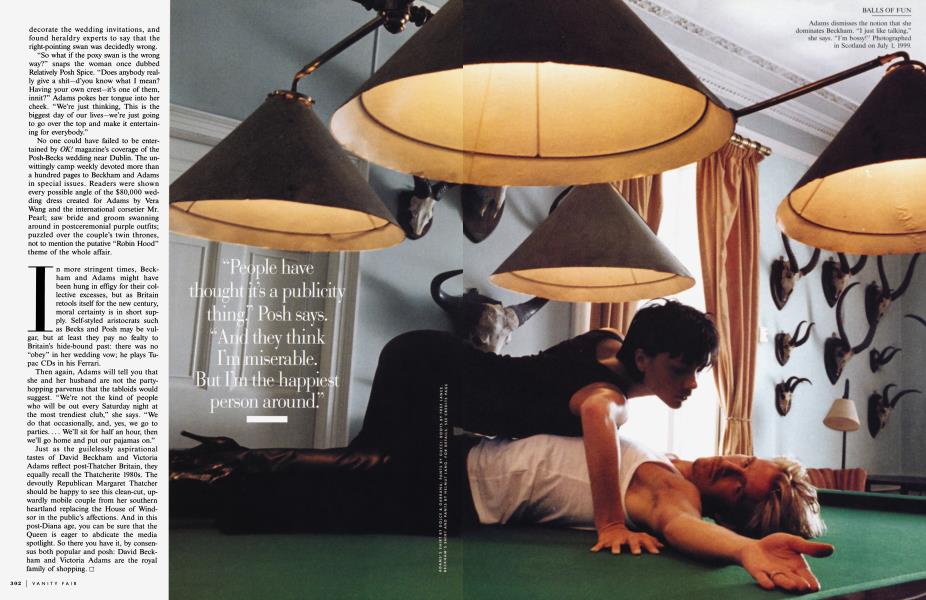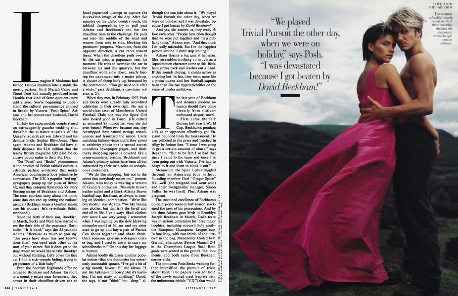 September 1999 Steven Daly Annie Leibovitz Nicoletta SantoroTwo of Britain s hugest celebrities, pop sensation Victoria "Posh Spice" Adams and soccer hero David Beckham, were married this July in a blaze of publicity that made the recent royal wedding look like a quiet trip to city hall. With the press jousting for details of their newly chosen crest, the tally on their latest shopping spree, and a glimpse of their baby, Brooklyn, Posh and Becks talk to STEVEN DALY about how they see themselves reflected in the paparazzi glare—and what lies behind the tabloid image
